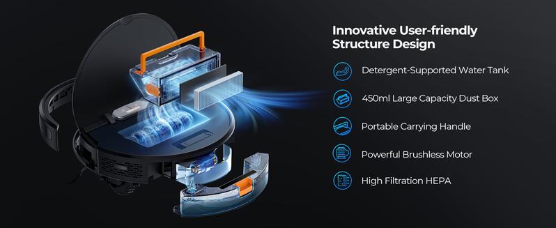【All-in-1, Vacuum & Mop & Sweep】The robot vacuum cleaner integrates sweeping, suction, and mopping functions. The dust box and water tank can be installed simultaneously without the need for repeated replacement. You can choose to sweep only, mop, or both, greatly improving cleaning efficiency and handling all types of dirt, whether it's dust, debris, or liquid.