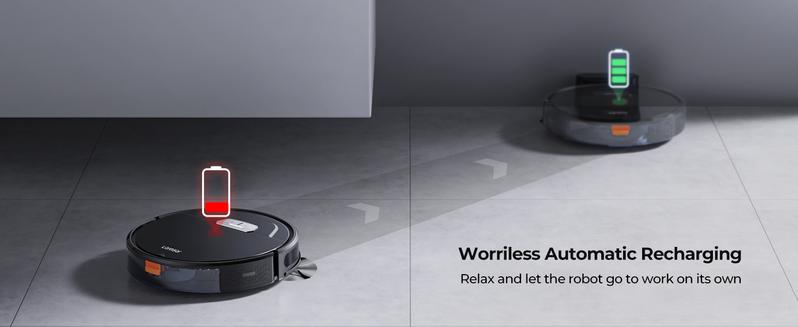 【180mins Runtime & Self-Charging】With 3200mAh large capacity battery, the robotic vacuum cleaner can continuously work 180mins that ensure all your cleaning tasks are completed smoothly. When in low battery or cleaning completed, it will automatically run back to the charging base and recharge.