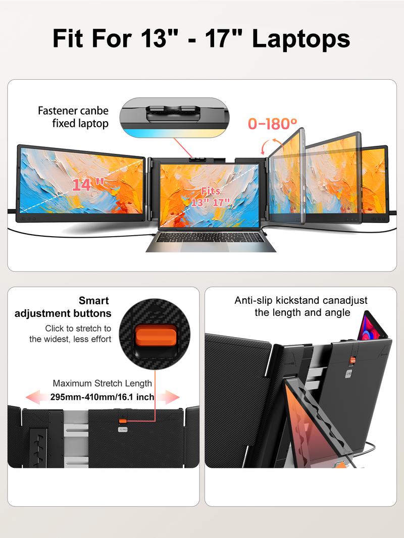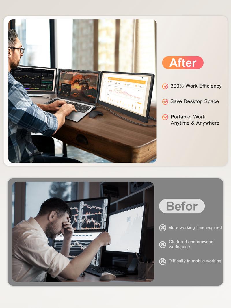 Triple Screen Sync & 300% Increased Work Efficiency This Triple screen laptop extender enables seamless multitasking. In extended or mirror mode, manage multiple windows effortlessly, increasing work efficiency by 300%. Perfect for IT professionals, stock traders, and students.