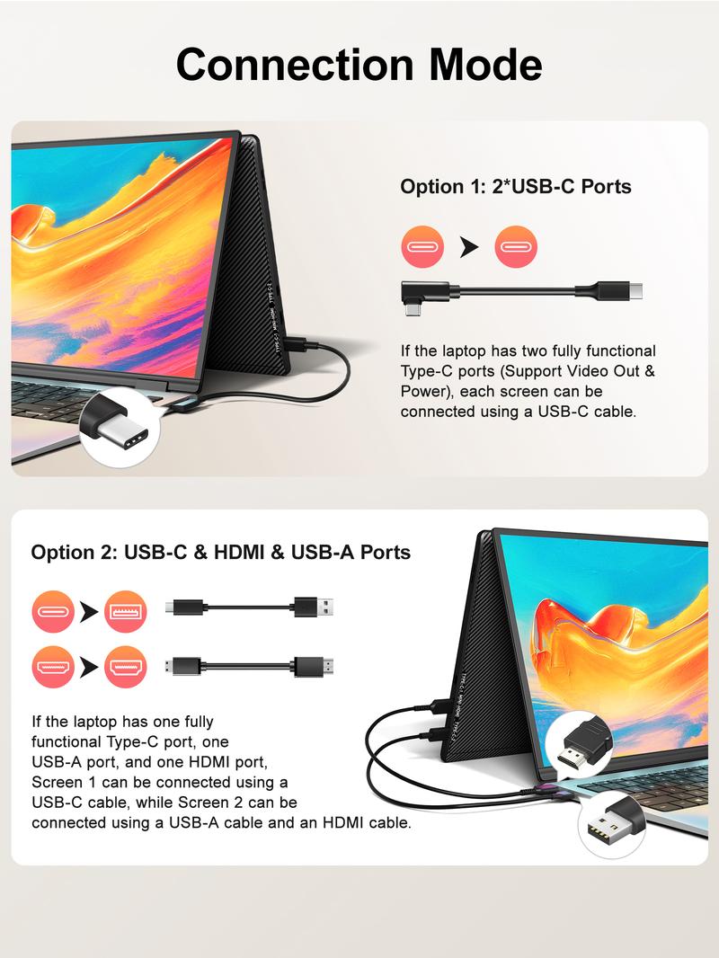 Easy to Use, Plug and Play Includes necessary cables for seamless setup. For laptops with Type-C ports, one USB-C cable is needed. If lacking a Type-C port, use one USB-A and one HDMI cable. Setup is simple and fast.