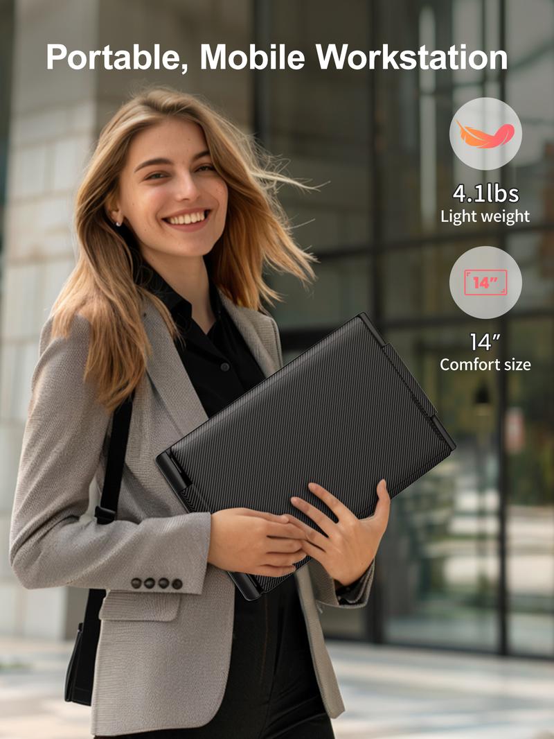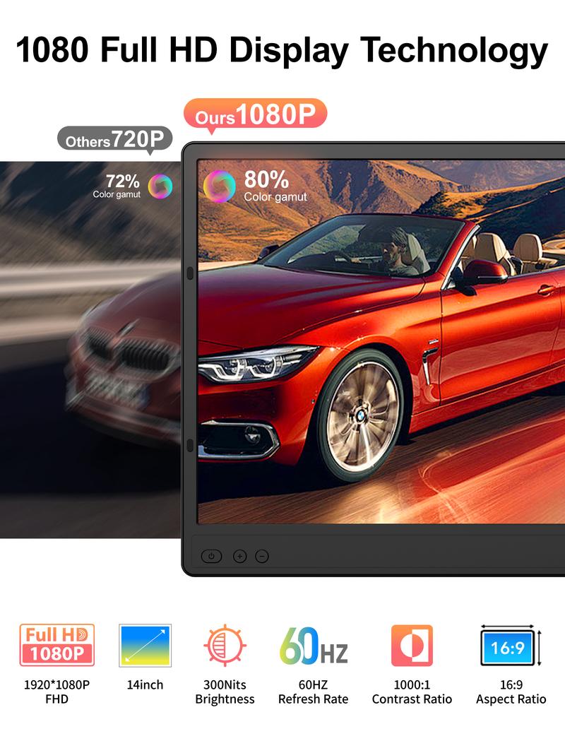HD Display & Wide Support Bracket The 14-inch Full HD IPS display offers 1920x1080 resolution, 300 nits brightness, and a 1000:1 contrast ratio. It supports brightness and volume adjustments for a comfortable experience. The widened back stand provides stable support.